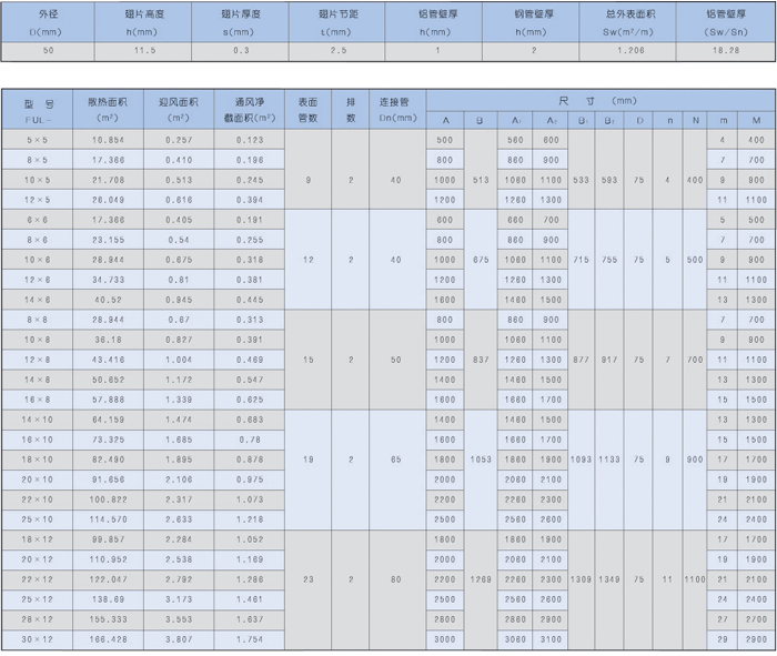 FUL型散熱器型號規(guī)格表示方法:型號--迎風(fēng)面長的分米數(shù)化整×迎風(fēng)面寬的分米數(shù)化整。如:迎風(fēng)面長為1000mm,迎風(fēng)面寬為837mm。則為:FUL-10×8。