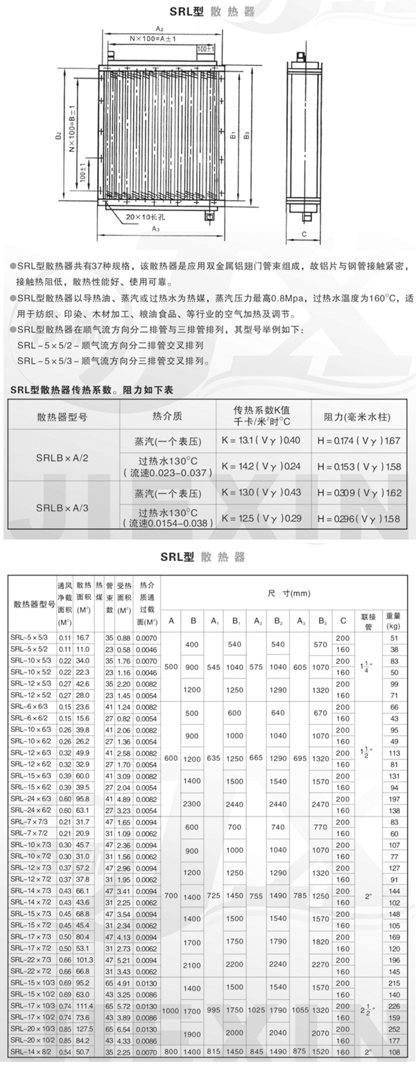 一.產(chǎn)品概況SRL型散熱器,是以蒸汽和130—70℃熱水為媒質(zhì),廣泛應(yīng)用于工業(yè)建筑,民用建筑中采暖、局部采暖及熱風(fēng)采暖,空調(diào)系統(tǒng)中作為空氣加熱用,并取得良好效果!